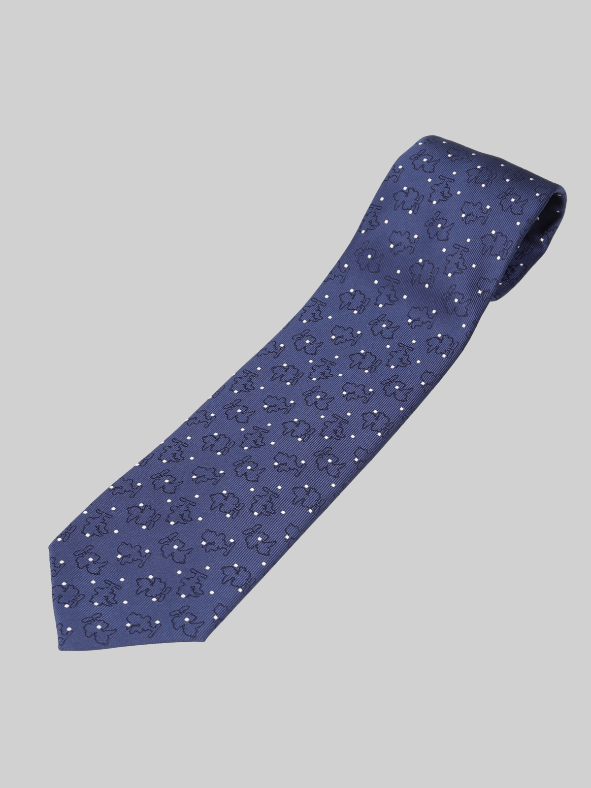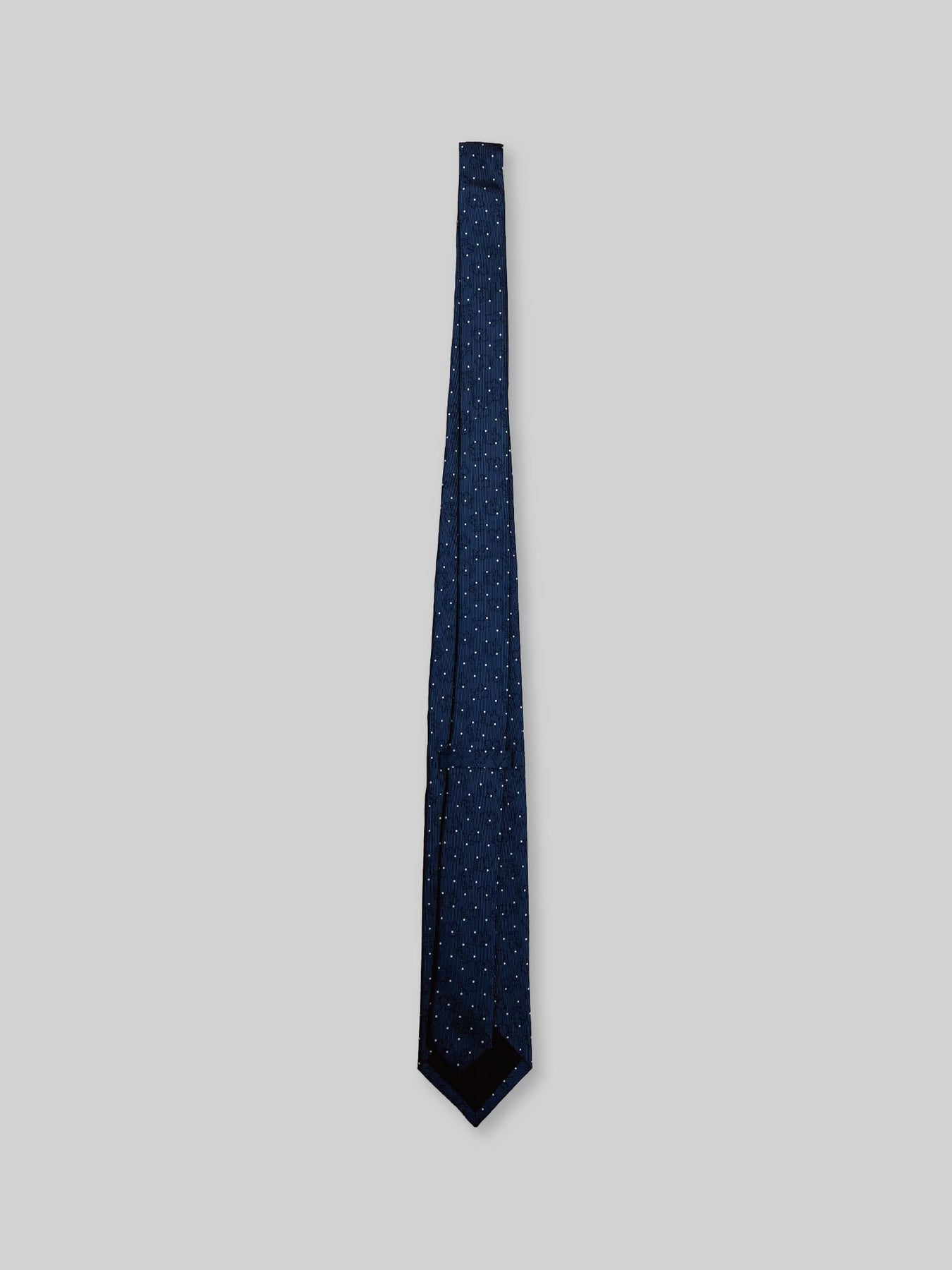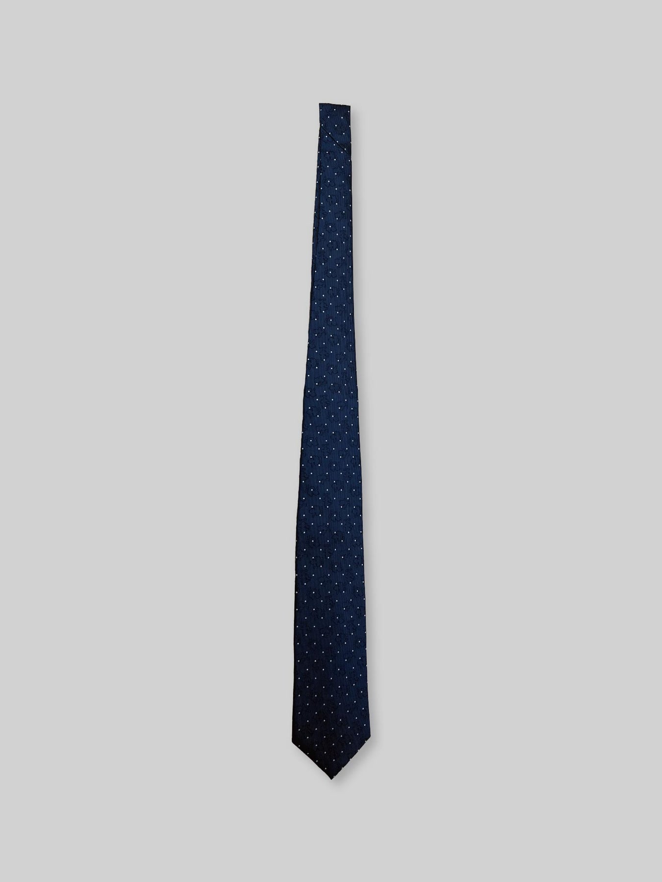 合わせやすいネイビーベースに、ドット柄とJIN&KANAのシルエットをジャガードで表現したネクタイです。