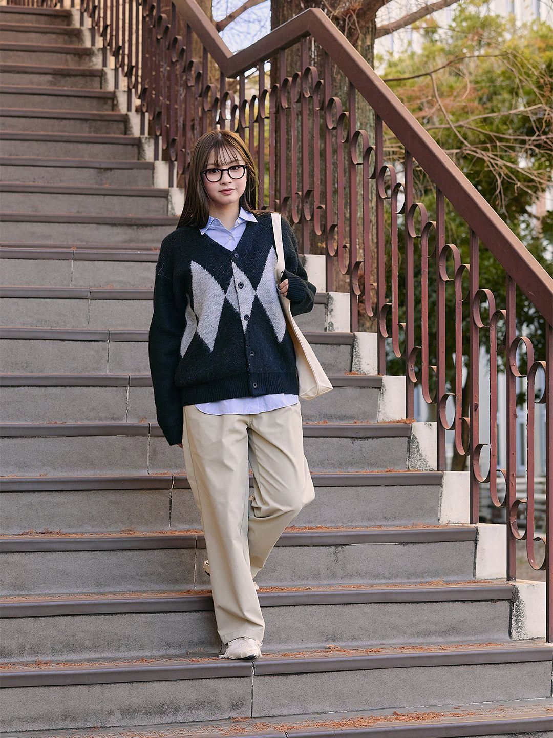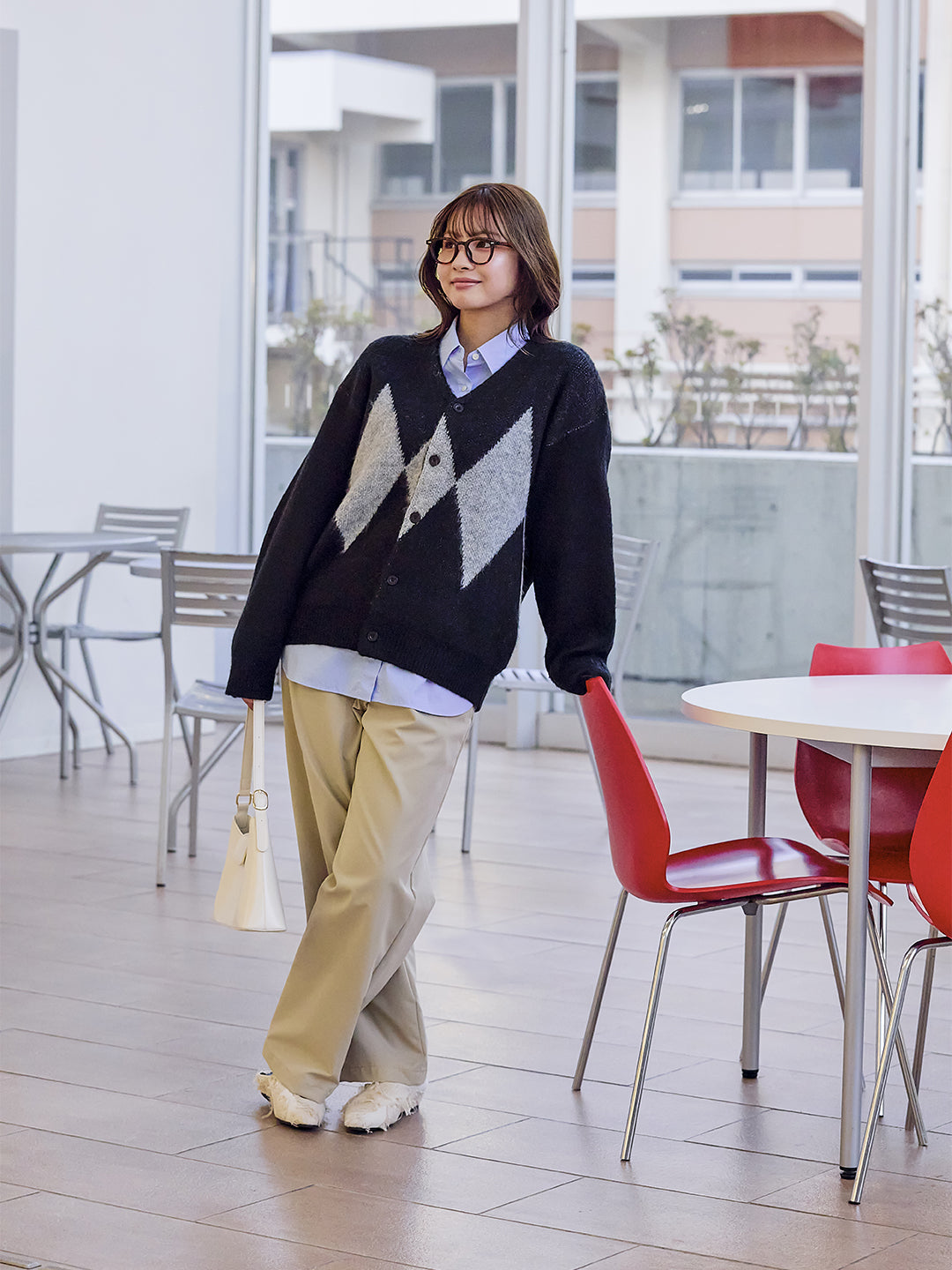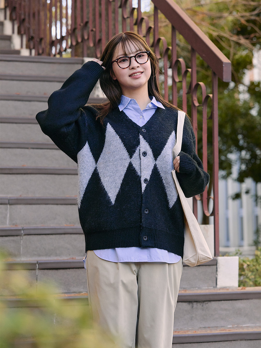 柔らかな風合いが魅力の、アーガイル柄カーディガン。