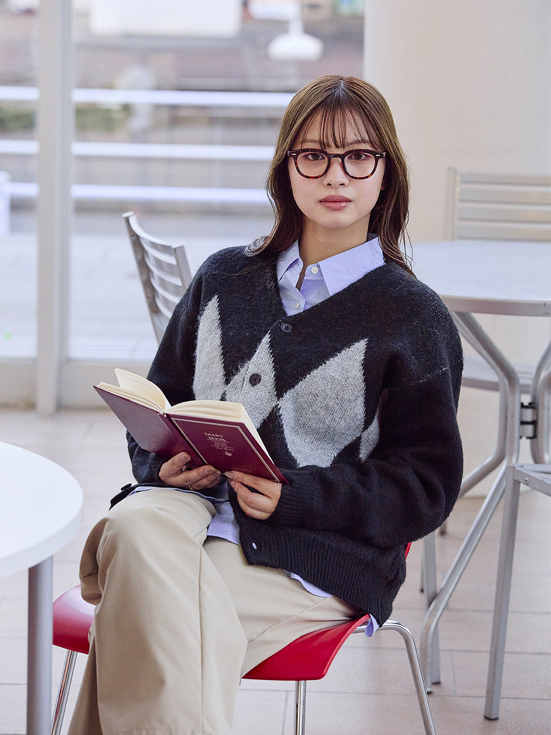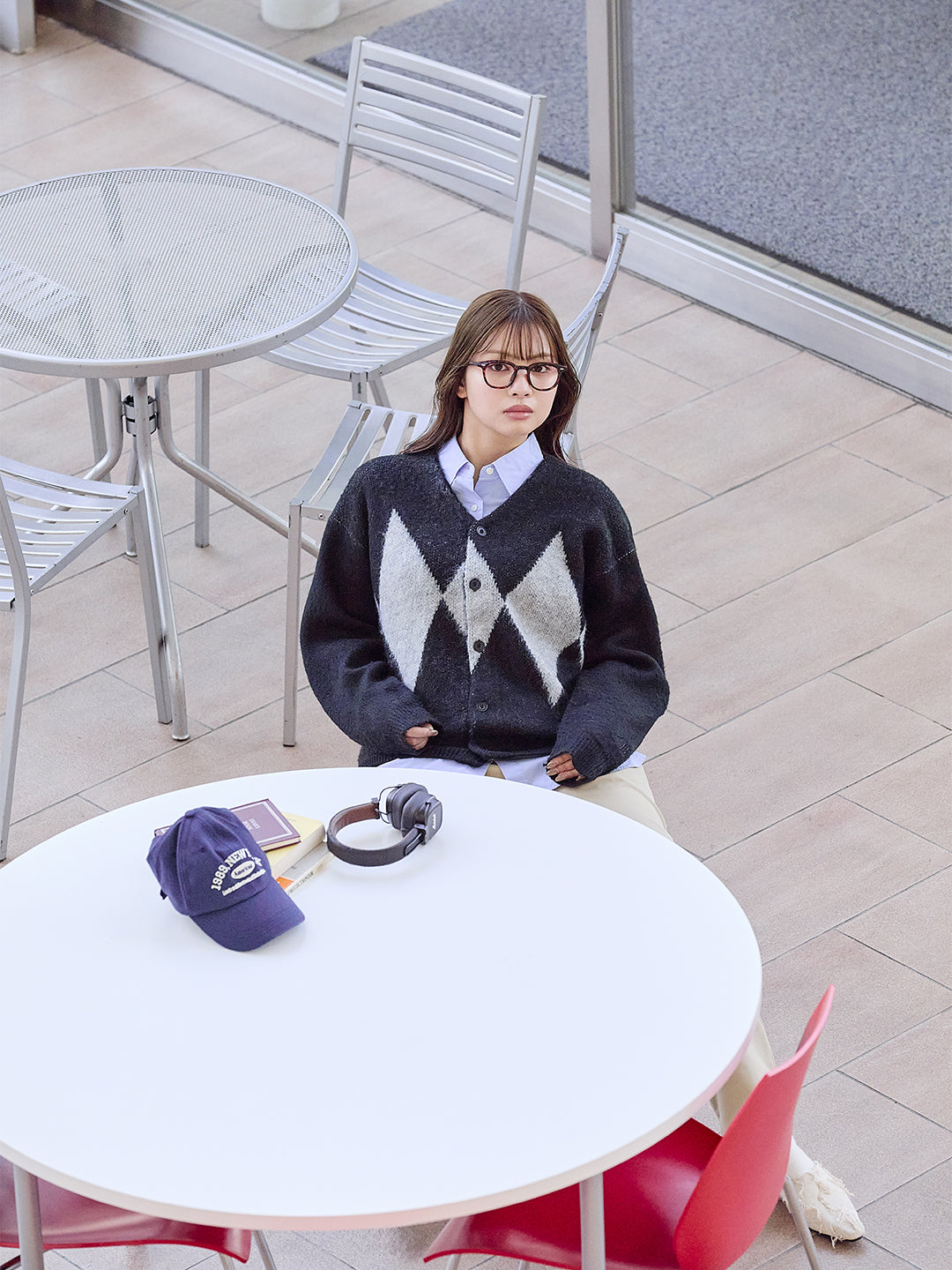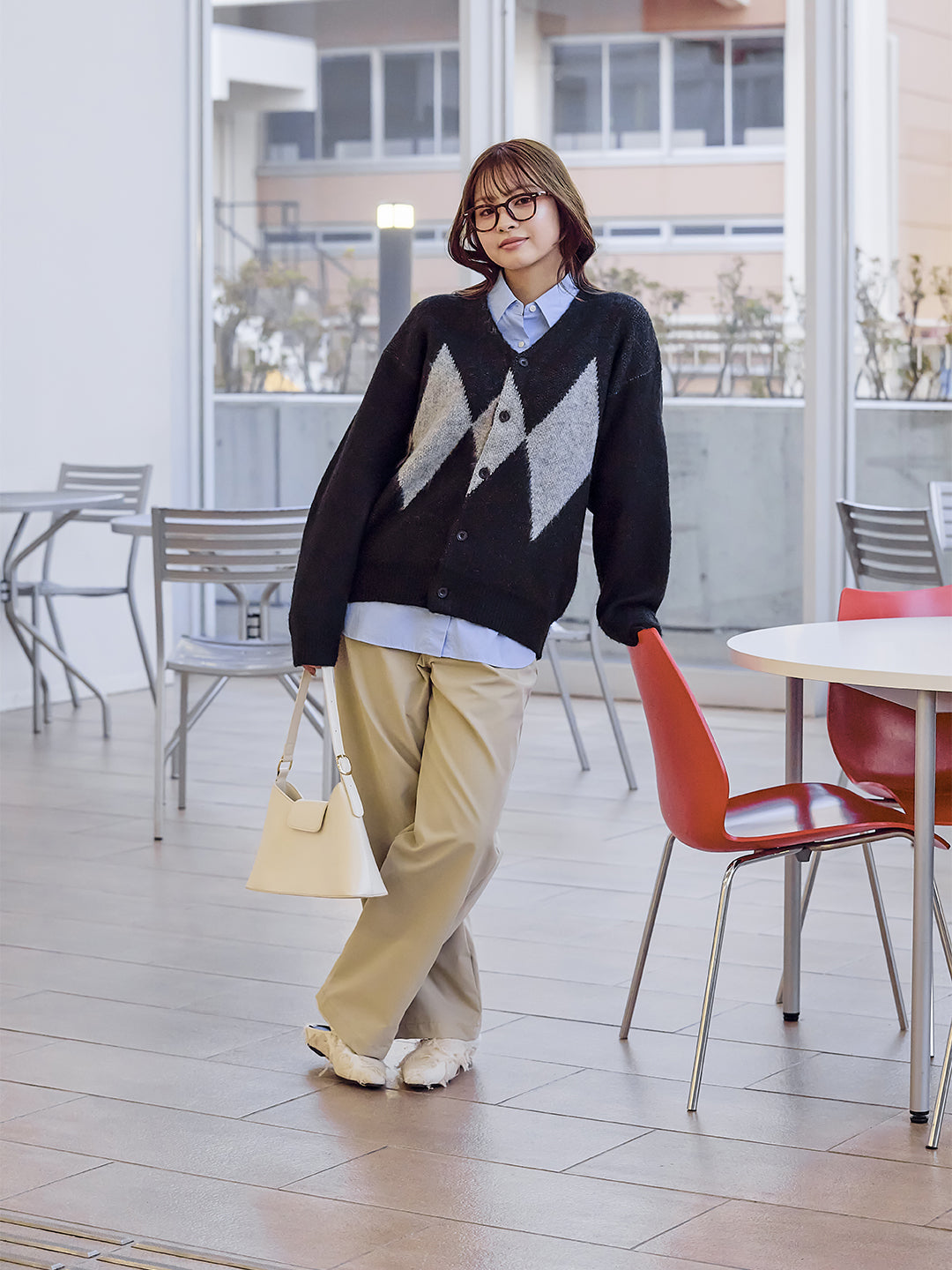 柔らかな風合いが魅力の、アーガイル柄カーディガン。