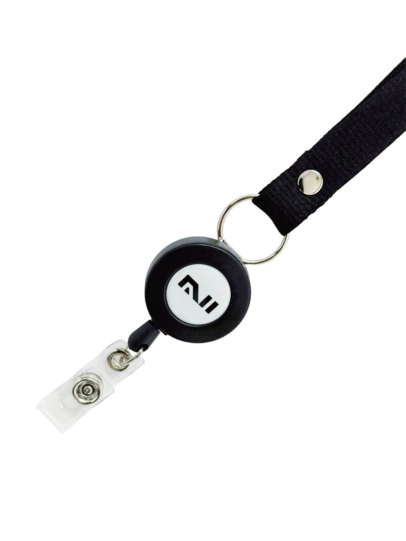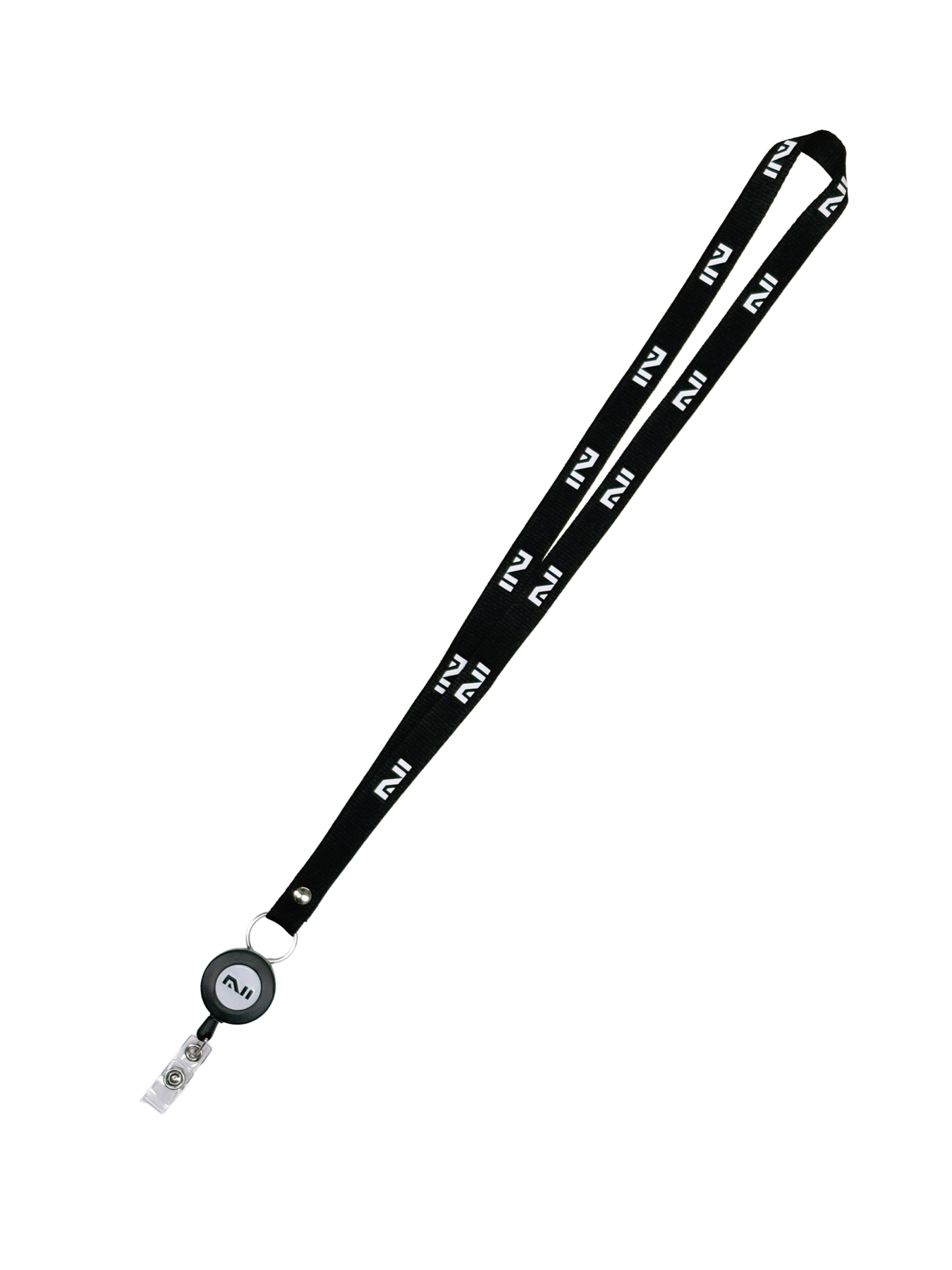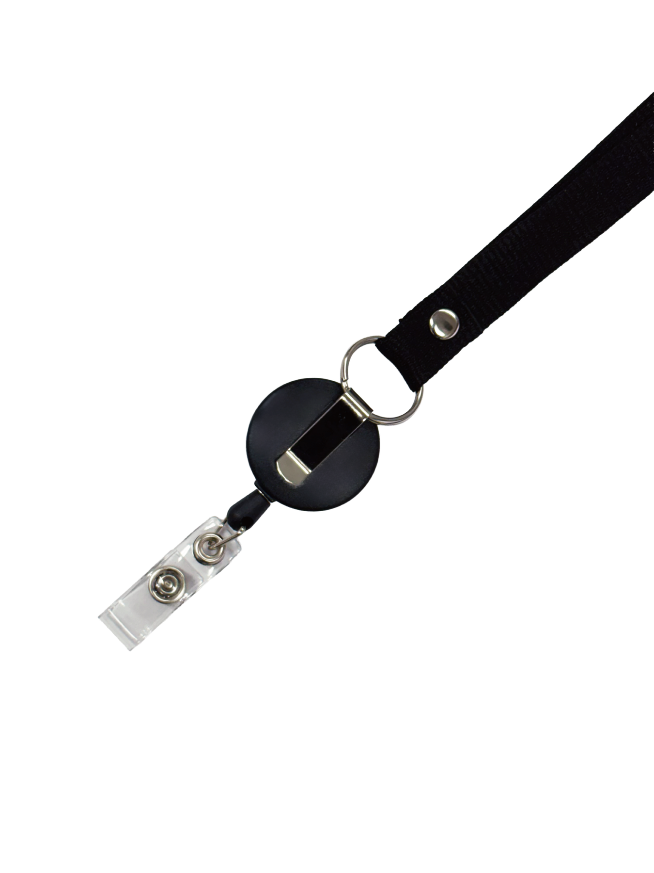 先端に二重リングとリールクリップが付いた15mm幅・平織りポリエステル素材のネックストラップ。